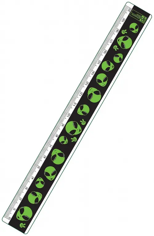 Линейка. ИНОПЛАНЕТЯНЕ Материал: алюминий. Размер: 20,7х2,4 см. Разметка: 20 см. Отделка: шелкография в две краски. Цвет: зелёный, чёрный. Пол: для мальчиков. Индивидуальная упаковка: ПЭТ-пакет.