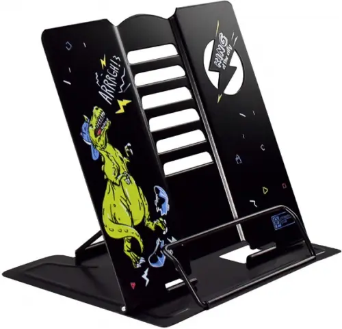 Подставка для книг и учебников. ЗЛОЙ ДИНО. Размер: 19х20х15.5 см. Материал: окрашенный чёрный металл. Регулировка угла наклона - есть. Количество углов наклона - шесть. Прижим для фиксации страниц - есть. Отделка: УФ-печать, фигурная вырубка. Пол: для мальчиков. Индивидуальная упаковка: ПЭТ-пакет.