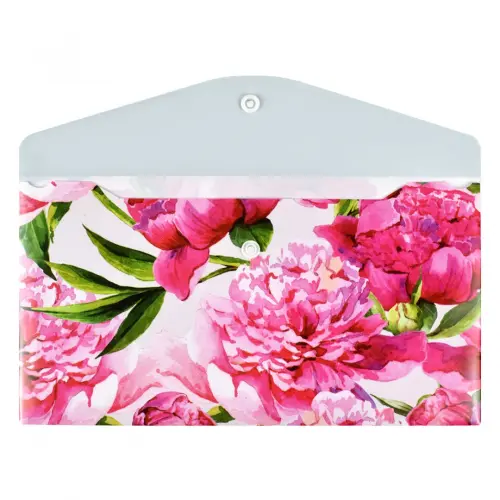 Папка для документов. НЕЖНЫЕ ЦВЕТЫ. Размер: 26x14 см. Материал: полипропилен. Толщина: 180 мкм. Количество отделений: 1. Тип застёжки: кнопка. Цвет - розовый. Отделка: УФ-печать.
