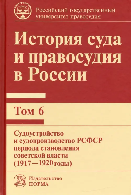 Шестой том монографии «История суда и правосудия в России» посвящен судоустройству и судопроизводству периода становления советской власти (1917—1920 гг.). Показан процесс становления суда и правосудия советского государства в первые месяцы советской власти, ориентированный на слом дореволюционного судебного аппарата Временного правительства и формирование нового пролетарского суда. Особое внимание уделено характеристике чрезвычайного правосудия, осуществляемого революционными трибуналами и революционными военными трибуналами. Исследована деятельность ВЧК, сочетающей одновременно функции правотворческого, следственного и судебного органа. Раскрыты особенности проведения красного террора и его юридическая природа. Рассмотрена система негосударственных судов, санкционированных советской властью: дисциплинарных товарищеских, шариатских и третейских.