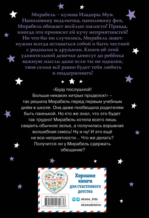 Книги о Мирабель рассказывают детям, как важно всегда оставаться собой и в то же время уметь отвечать за свои поступки. Лёгкий слог, интересная история и красивые фиолетовые иллюстрации. Обязательно к прочтению для всех поклонников серии «Изадора Мун»!