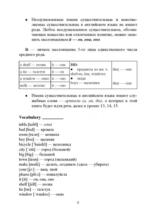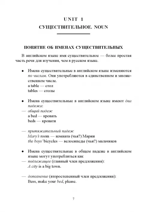 Книга «Имя существительное» состоит из шестнадцати уроков. Пятнадцать уроков в интересной форме представляют определенные разделы грамматики. В уроки включены таблицы, просто и доступно объясняющие грамматические правила. В каждом разделе даны обязательные упражнения, с картинками и заданиями, поясняющими выполнение упражнений. В конце каждого урока представлен словарь, который рекомендуется освоить. Отдельный урок посвящен освоению словарного запаса по школьной тематике. В книгу включены разделы по чтению (READING) с небольшими стихами и текстами (в основном авторскими).