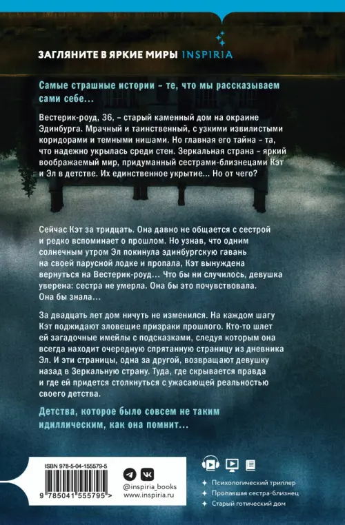 Вестерик-роуд, 36, - старый каменный дом на окраине Эдинбурга. Мрачный и таинственный, с узкими извилистыми коридорами и темными нишами. Но главная его тайна - та, что надежно укрылась среди стен. Зеркальная страна - яркий воображаемый мир, придуманный сестрами-близнецами Кэт и Эл в детстве. Их единственное укрытие... Но от чего?