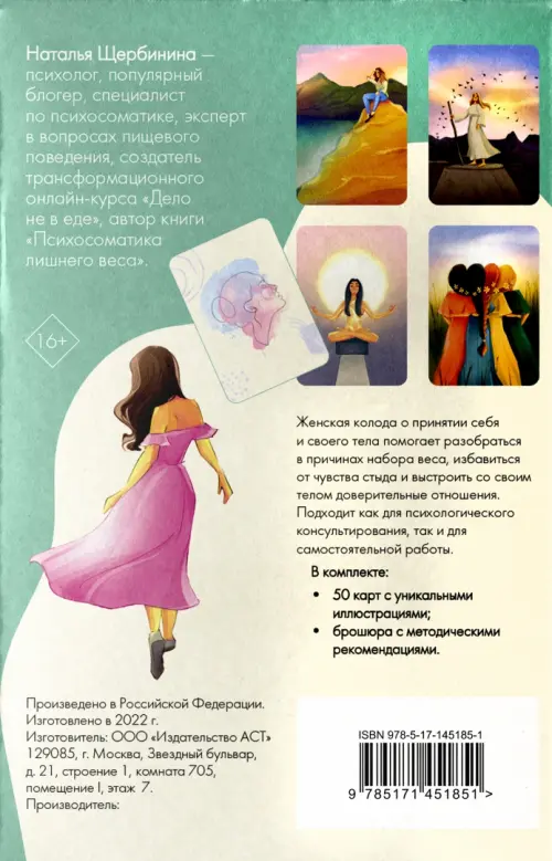 Метафорические ассоциативные карты «Психосоматика. Принятие своего тела» — авторская женская колода для работы с первопричинами лишнего веса и проблемами пищевого поведения. В каждой из 50 карт зашифрован определенный смысл, послание автора, дешифрующее и интерпретирующее переживания и страхи, чувства и эмоциональные состояния реальных женщин, столкнувшихся с проблемой разрыва связи с собственным телом. Колода Натальи Щербининой подходит как для психологического консультирования, так и для самостоятельной работы.