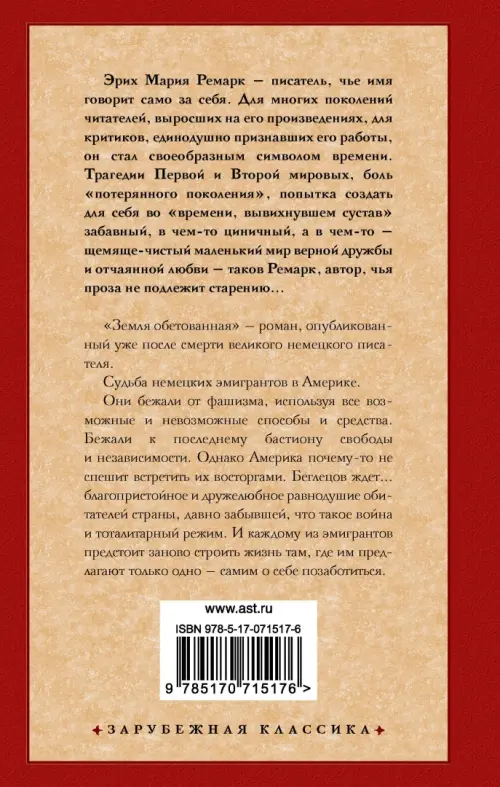 "Земля обетованная" - роман, опубликованный уже после смерти великого немецкого писателя. Судьба немецких эмигрантов в Америке. Они бежали от фашизма, используя все возможные и невозможные способы и средства. Бежали к последнему бастиону свободы и независимости. Однако Америка почему-то не спешит встретить их восторгами. Беглецов ждет… благопристойное и дружелюбное равнодушие обитателей страны, давно забывшей, что такое война и тоталитарный режим. И каждому из эмигрантов предстоит заново строить жизнь там, где им предлагают только одно - самим о себе позаботиться.