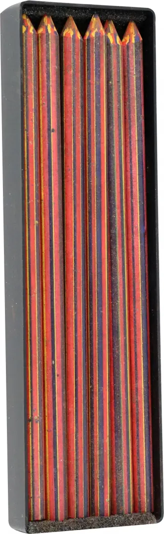Стержни с многоцветным грифелем позволяют создавать переходы цвета всего лишь одним движением карандаша. При работе образуется единая многоцветная линия, сплетенная из нескольких линий разных цветов. Цвет линии меняется при изменении угла наклона карандаша. Грифель устойчив к механическим повреждениям.