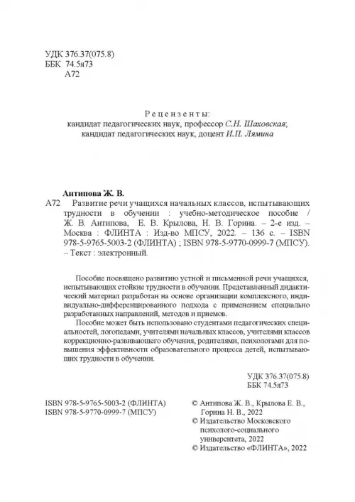 Пособие может быть использовано студентами педагогических специальностей, логопедами, учителями начальных классов, учителями классов коррекционно-развивающего обучения, родителями, психологами для повышения эффективности образовательного процесса детей, испытывающих трудности в обучении.