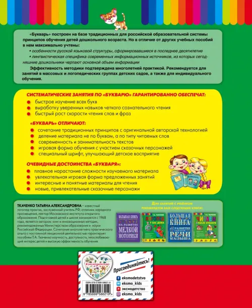 Наличие сказочных персонажей позволяет усваивать знания в игровой форме. Помимо рассказов, букварь содержит оригинальные тексты для чтения (весёлые стихи, "вместечиталки", загадки, трудноговорки, перепутанки, стихотворные правила, рифмовки-шутки и пр.). Букварь рассчитан на работу с детьми дома, в школах, гимназиях, массовых и логопедических группах детских садов, то есть универсален.