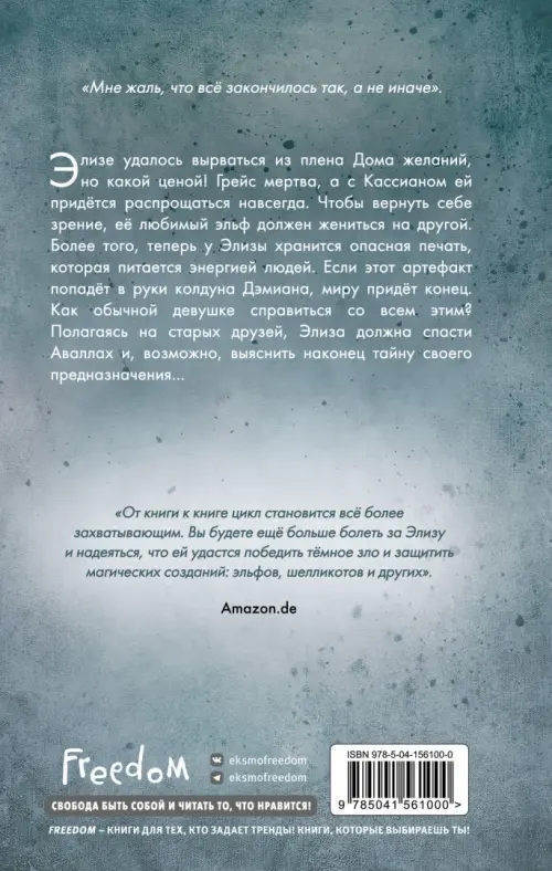 «Мне жаль, что все закончилось так, а не иначе». Элизе удалось вырваться из плена Дома желаний, но какой ценой! Грейс мертва, а с Кассианом ей придется распрощаться навсегда. Чтобы вернуть себе зрение, ее любимый эльф должен жениться на другой. Более того, теперь у Элизы хранится опасная печать, которая питается энергией людей. Если этот артефакт попадет в руки колдуна Дэмиана, миру придет конец. Как обычной девушке справиться со всем этим? Полагаясь на старых друзей, Элиза должна спасти Аваллах и, возможно, выяснить наконец тайну своего предназначения…