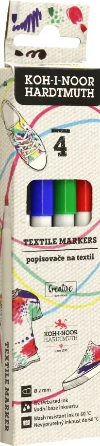 Набор из 4 цветов круглых маркеров для рисования и письма по ткани и бумаге. Чернила на водной основе. Светостойкие цвета. Выдерживают многократную стирку текстиля при температуре не более 60 градусов.