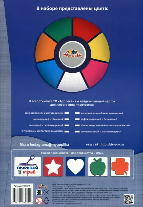 В наборе цвета: красный, зеленый, желтый, оранжевый, малиновый, синий, белый. Цветной картон предназначен для создания детских поделок, аппликаций и декорирования. Картон легко режется ножницами, сгибается и клеится.
