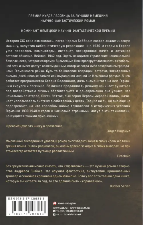История XIX века изменилась, когда Чарльз Бэббидж создал аналитическую машину, запустив кибернетическую революцию, и к 1930-м годам в Европе уже появились компьютеры, интернет, электронная почта и активное сетевое общение. Веймар, 1942 год. Здесь находится Управление национальной безопасности, которое со времен Вильгельма II контролирует активность в глобальной сети и имеет доступ ко всем данным, которые когда-либо создавались гражданами Германского рейха, будь то банковские операции, встречи, электронные письма, дневниковые записи или выражения мнений на Немецком форуме. В нем работает программистка Хелена Боденкамп, дочь знаменитого на всю Германию хирурга и евгеника. Ее личная преданность режиму начинает рушиться под воздействием личных обстоятельств и одновременно она узнает, что начальник ее отдела, Ойген Леттке, сын героя Первой мировой войны, начинает использовать систему в собственных целях. Только ни он, ни она еще не подозревают, на что способны новые технологии в исторических условиях Германии 1930-1940-х годов и насколько страшными могут быть технологии, кажущиеся такими привычными.
