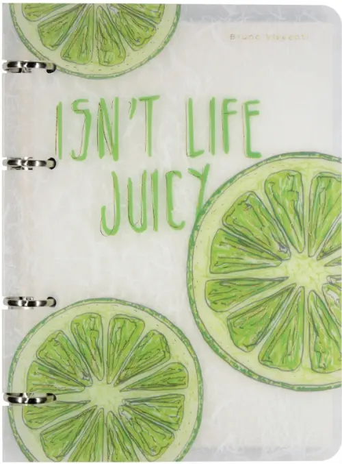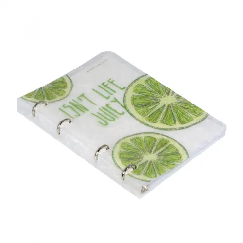 Обложку тетради на кольцах со сменным блоком серии "Fresh & Fruity. Лайм" украшают сочные лаймы, необычайно красивые в разрезе. Отдельные элементы дизайна проработаны при помощи тиснения золотой фольгой. Обложка тетради изготовлена из гибкого полупрозрачного белого пластика, который прекрасно защищает блок от механических повреждений и замятий, при этом значительно уменьшает вес тетради. Белая офсетная бумага блока плотностью 70 г/кв.м позволяет использовать ручки с чернилами различного качества. Блок имеет линовку в клетку и дополнительно украшен оригинальными дизайнерскими элементами. Благодаря кольцевому механизму студент сможет самостоятельно изменять количество и порядок листов в блоке в зависимости от учебного расписания.