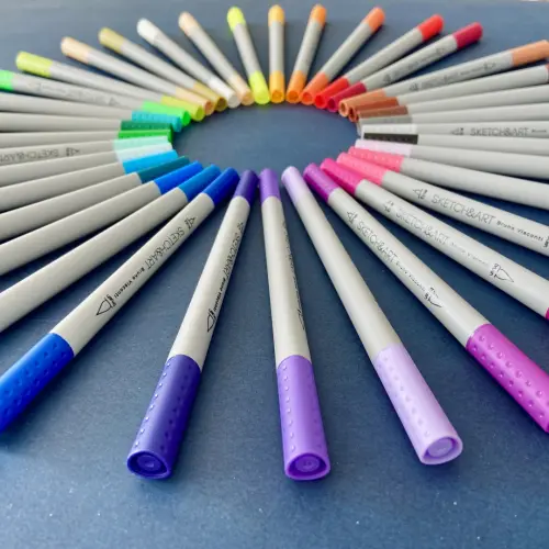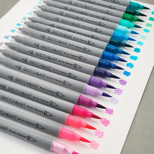 Набор двусторонних скетч-маркеров «Sketch&Art» – это 48 цветов и безграничные возможности для творчества, реализации идей с помощью линера и brash-кисти. Линер – универсальный для скетчинга инструмент, с помощью которого наносят контуры под маркеры или акварель, делают записи и наброски. Он дает четкий штрих и равномерную тонкую линию. Гибкий, легко принимающий прежнюю форму наконечник-кисть имеет возможность создавать линии различной ширины – от 1 до 3 мм в зависимости от угла и силы нажатия. Она идеальна для тех, кто желает преуспеть в скетчинге, леттеринге, каллиграфии. Перманентные чернила маркера на водной основе, быстросохнущие и светостойкие, что важно – нетоксичные. Эргономичный корпус трехгранной формы имеет антискользящее покрытие, а вентилируемый колпачок в цвет чернил - точечные углубления, предотвращающие скольжение пальцев рук при открывании маркера.