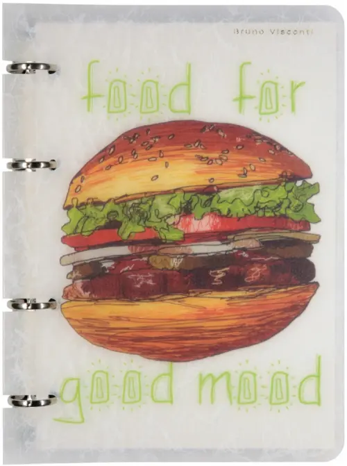 Создать прекрасное настроение студенту всегда поможет вкусная и питательная еда, поэтому наши художники разработали оригинальный дизайн тетради на кольцах серии "Fast Food". Отличная тетрадь с гибкой обложкой станет надежным спутником студентов в получении новых знаний. Обложка тетради выполнена из плотного полупрозрачного пластика, что позволяет использовать тетрадь длительное время, при этом сохраняя прекрасный внешний вид. Блок изготовлен из белой офсетной бумаги плотностью 70 г/кв.м, линовка блока в клетку позволяет вести записи по различным предметам учебной программы. Кольцевой механизм позволяет с легкостью изменять количество и порядок листов в блоке в зависимости от расписания. Для дополнительного удобства пользования тетрадью предлагаем приобрести разделители для тетрадей со сменным блоком.