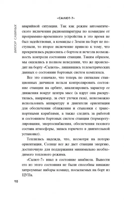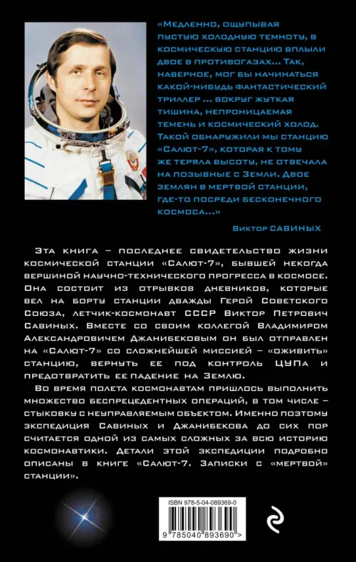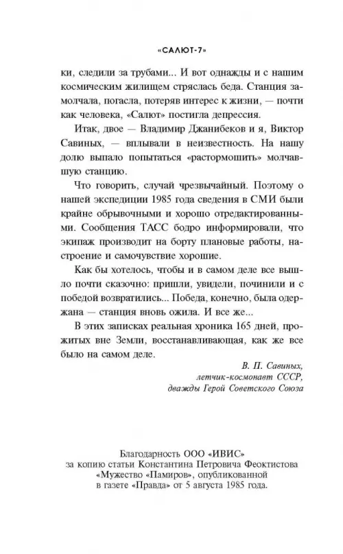 Эта книга - последнее свидетельство жизни космической станции "Салют-7", бывшей некогда вершиной научно-технического прогресса в космосе. Она состоит из отрывков дневников, которые вел на борту станции дважды Герой Советского Союза, летчик-космонавт СССР Виктор Петрович Савиных. Вместе со своим коллегой Владимиром Александровичем Джанибековым он был отправлен на "Салют-7" со сложнейшей миссией - "оживить" станцию, вернуть ее под контроль ЦУПа и предотвратить ее падение на Землю.