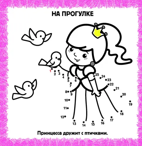 Эта весёлая обучающая раскраска откроет для малыша мир прекрасных принцесс и их друзей. Ребёнок сможет не только раскрасить картинки, но и дорисовать их, соединив точки по порядку, выучит цифры и узнает первые интересные факты о волшебном мире.