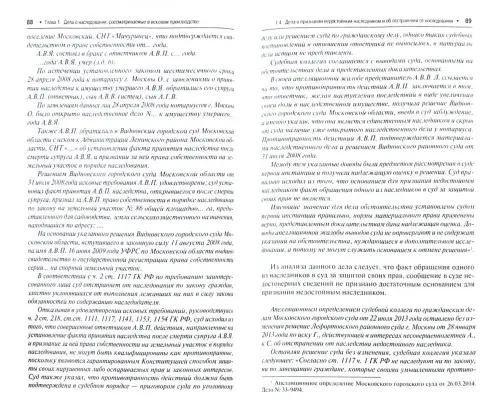 В работе исследована судебная практика по делам о наследовании: о признании недействительными завещаний, свидетельств о праве на наследство, о признании права собственности на наследство, об установлении факта принятия наследства, о восстановлении срока для принятия наследства и другие. Одни из этих дел рассматриваются в порядке искового производства, другие - в порядке особого судопроизводства. Представлены также дела с участием иностранного элемента. По выявленным спорным вопросам применения гражданского, семейного, жилищного и административного законодательства даны научно-практические рекомендации с целью единообразия правоприменительной деятельности и устранения неясностей.