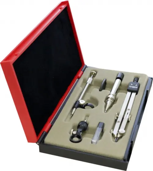 В наборе 6 предметов: циркуль, запасной грифель в футляре, кронциркуль с механическим карандашом, центрик.