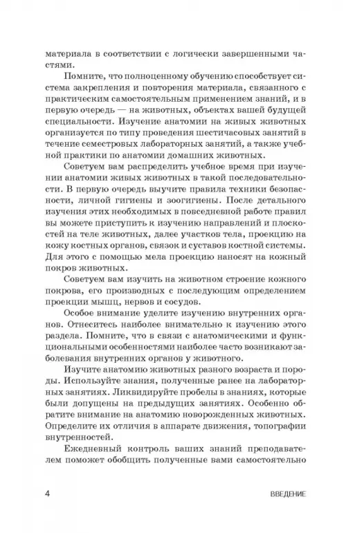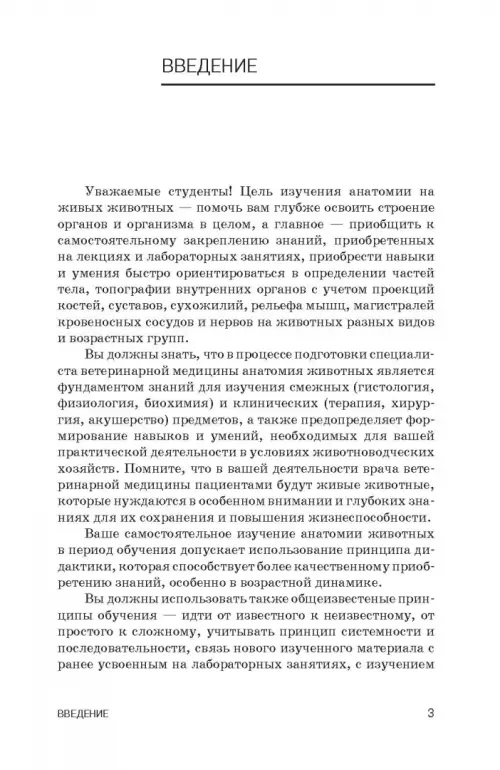 Для ВПО. Представлены методические подходы изучения анатомии на живых животных под контролем преподавателя. Занятия по изучению анатомии на живых животных проводят как во время лабораторных занятий, так и в период учебной практики по анатомии домашних животных. Показаны особенности изучения топографии и анатомии отдельных органов, систем, аппаратов и всего организма у живых лошади, быка, овец, свиньи, собаки разного возраста. Особенное внимание уделено изучению анатомии новорожденных животных, которая отсутствует в учебниках по анатомии домашних животных разных изданий. Изучение анатомии живых животных студентами проводится на животноводческой ферме, клинике факультета и кафедре. Учебно-методическое пособие рекомендуется для студентов, специалистов ветеринарной медицины и преподавателей биологических вузов.