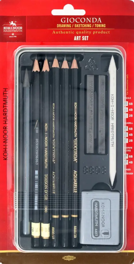 В наборе 10 предметов: графитный карандаш Progresso, 2 графитных карандаша (2В, 4В), 3 акварельных карандаша (2В, 4В, 6В), 2 графитных мелка, бумажная растирка, ластик-клячка.
