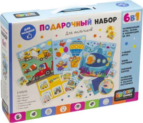 Подарочный набор 6в1, выполненный в дизайне серии Baby Games, создан специально для мальчиков! Внутри мы собрали красочные пазлы и развивающие настольные игры: лото, домино, мемори и аппликацию 22*22см с мягкими самоклеящимися деталями. Просто наклеивай слой за слоем. Получившаяся яркая 3D-картинка украсит ваш дом. Игры тренируют моторику, память, логику и внимательность ребенка. Коробка набора не требует дополнительной упаковки, а богатое наполнение подарит море радости!