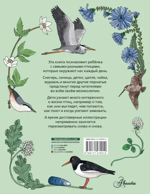 На страницах этого издания дети увидят множество птиц, знакомых и незнакомых, но невероятно интересных и удивительных. Читатель узнает, в чём разница между цаплей и журавлём, дроздами, снегирями, куликами и многими-многими другими пернатыми нашей планеты. Чем они питаются, где живут и куда улетают зимовать?
