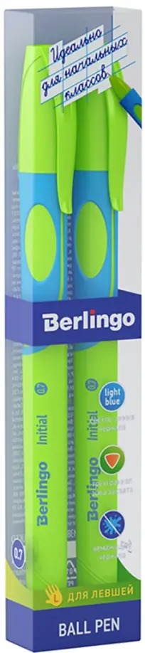 Шариковая ручка Berlingo Initial - идеальный инструмент дошкольника и первоклассника! Ручка выполнена в эргономичном трёхгранном корпусе увеличенного диаметра для максимального комфорта маленьких пальчиков. Мягкий резиновый грип в зоне захвата дополнен специальными выемками, которые обозначают места правильного расположения пальцев для оптимального письма и постановки лучшего почерка. Светло-синие чернила со специальной формулой мгновенного высыхания позволяют оформлять работу аккуратно и без "смазывания" надписей как правшам, так и левшам. Надписи, сделанные такими чернилами легко читаются. На задней части ручки есть обозначение "L" или "R" для левшей или правшей. Кроме того, ручки производятся по принципу цветового кодирования: зеленый корпус для левшей, а оранжевый для правшей. Поставляются ручки в пластиковом пенале по 2 штуки.