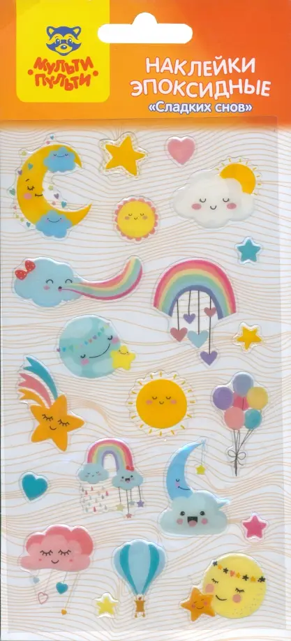 Эпоксидные наклейки «Сладких снов» - это отличный материал для творчества и игры. В наборе «Мульти-Пульти» 21 наклейка, размер листа 110*220 мм. Наклейки можно использовать для украшения и декорирования, а также для игр, оформления рисунков, открыток. Эпоксидные наклейки обладают выпуклой, прозрачной и гладкой поверхностью, приятной наощупь. Комбинируя наклейки из различных наборов «Мульти-Пульти» можно придумать целые творческие сюжеты!