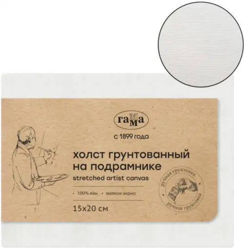 Льняной холст на подрамнике ГАММА, загрунтованный вручную, подходит для работ акриловыми и масляными красками. Основа – высококачественное 100% льняное полотно, мелкое зерно. Холст прямоугольной формы плотностью 370 г/м2, размер – 15*20 см. Хосты натягиваются и грунтуются вручную: полотно натягивают на сосновый подрамник с бортиком. Перед грунтовкой ткань проходит специальную обработку и проверку, для обеспечения ровной поверхности готового холста. Мастера ГАММА сначала проклеивают каждый подрамник с натянутым полотном тремя слоями желатиновой проклейки, а затем грунтуют тремя слоями масляно-эмульсионного грунта. Холст упругий, не провисает после нанесения красок даже в несколько слоёв. Массивный модульный подрамник шириной 4 см изготовлен из российской сосны, в комплект входят клинья для натяжки холста. Холст упакован в термоусадочную пленку, предохраняющую его от вредных воздействий внешней среды.