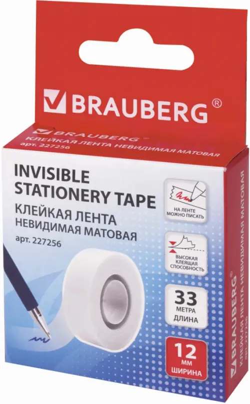 Имеет гарантированную длину 33 м и ширину 12 мм и обладает высокой клеящей способностью. Отличается прозрачностью и прочностью 35 мкм. Невидимая и матовая. Не скручивается и не желтеет со временем. Для производства канцелярских лент используется сырьё с клеем на основе акриловой эмульсии. Поставляется в картонной коробке.