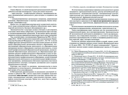 В представленном научном исследовании авторами сделана попытка в единстве и взаимосвязи проанализировать основные начала кластерной политики в современной России. В книге раскрываются: понятие, сущность и виды кластеров. Особое внимание уделяется инновационным кластерам (медицинским, спортивным, фармацевтическим и др.). При изложении материала освещаются различные точки зрения относительно кластеров и их возможных видов.