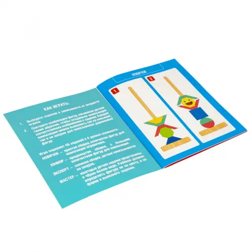 В настольной игре 4 уровня сложности и 48 заданий. На уровне НОВИЧОК для сборки понадобится не так много фигур. А вот на уровне МАСТЕР, задания сложные и дети должны определить фигуру не по цвету, а по форме.