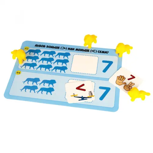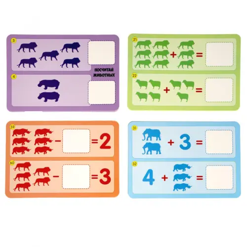 Выполните задания на карточке, указав ответ на ней с помощью маркера или поместив туда мини карточку с числом. Фигурки с животными наглядно помогут в решении арифметических задач. Используйте фигурки, размещая их на карточке.