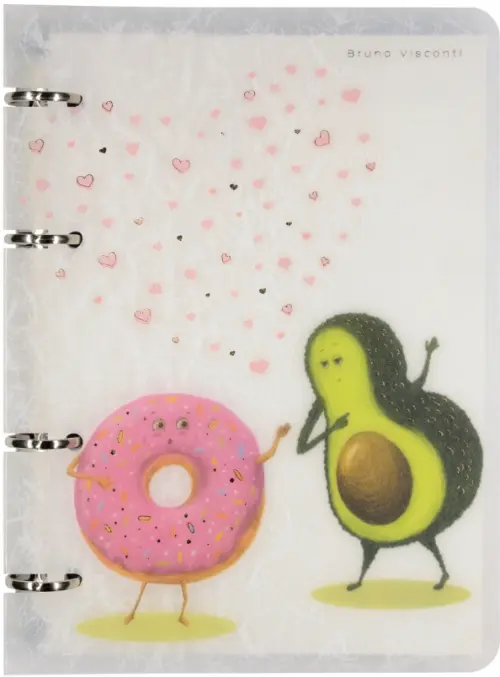 Прекрасная парочка: полезный, вкусный авокадо и пышный, сладкий пончик, - украсили обложку тетради на кольцах серии "АВОКАДО И ПОНЧИК". Тетрадь с кольцевым механизмом по достоинству оценят студенты колледжей и ВУЗов, тетрадь станет прекрасным спутником в освоении новых знаний. Благодаря наличию кольцевого механизма студент сможет самостоятельно определять количество и порядок листов в блоке в зависимости от учебного расписания. Блок тетради состоит из 80 листов, отпечатанных на белой офсетной бумаги плотностью 70 г/кв.м, линовка блока - клетка, каждая страница блока имеет дополнительные дизайнерские элементы. Обложка тетради изготовлена из белого полупрозрачного пластика, который прекрасно предохраняет блок от повреждений. Углы обложки скруглены. Мелкие элементы дизайна обложки подчеркнуты золотой фольгой.