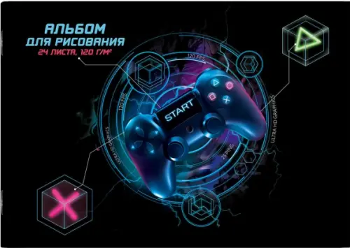 Альбом для рисования 24 л, А4 (285х200 мм), блок - белый офсет 120 г/м2, обложка - полноцветная печать, сплошной УФ-лак, мягкий переплёт (2 скобы)