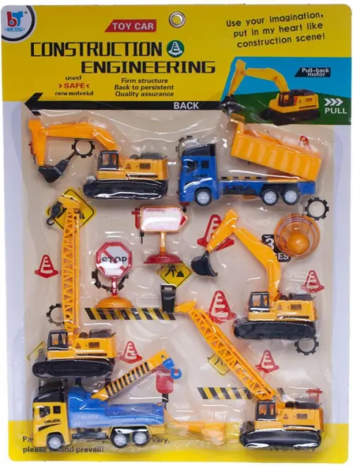 Все мальчишки любят играть со строительными машинками. В состав этого набора входят необходимые на любой стройке машины: экскаватор, подъемный кран с крюком, подъемный кран с люлькой, экскаватор-разрушитель на гусеничном ходу, самосвал и грузовик-эвакуатор. Машинки изготовлены из пластмассы, имеют подвижные детали, выполнены в традиционных цветах, некоторые единицы имеют подвижные детали, оснащены инерционным механизмом. Если оттянуть машинку назад, а затем отпустить, она поедет вперед.