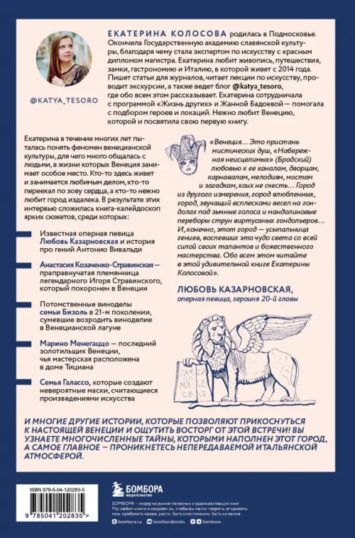 «Венеция... Это пристань мистических душ, "Набережная неисцелимых" (Бродский) любовью к ее каналам, дворцам, карнавалам, мелодиям, мостам и загадкам, коих не счесть... Город из другого измерения, город влюбленных, город, звучащий всплесками весел на гондолах под зычные голоса и мандолиновые переборы струн виртуозных гондольеров… И, конечно, этот город — усыпальница гениев, воспевших это чудо света со всей силой своих талантов и божественного мастерства. Обо всём этом читайте в этой удивительной книге Екатерины Колосовой». — Любовь Казарновская, оперная певица, героиня 20-й главы