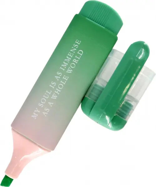 Текстовыделитель зеленый. Скошенный наконечник обеспечивает толщину линии письма от 1 до 5 мм. Стойкие чернила позволяют использовать текстовыделитель на бумаге любой плотности. Колпачок снабжен специальным зажимом, с помощью которого можно прикрепить маркер к любой обложке.