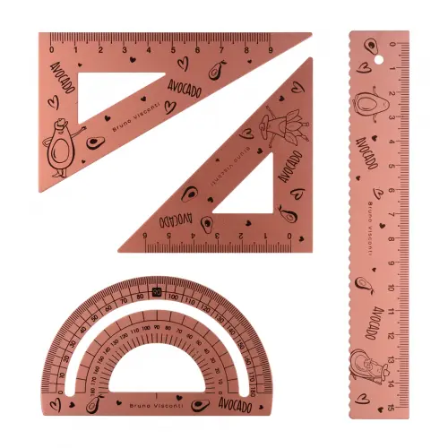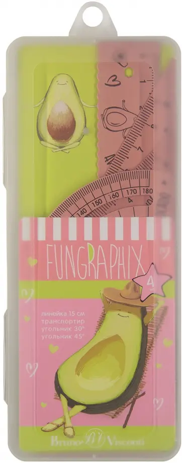Такие забавные принты не могут не поднять настроение, их так и хочется изучать детально. Разве можно не порадовать ребенка подобным набором. Учеба должна быть в радость! Набор "FunGraphix" из 4-х металлических измерительных инструментов в пластиковом пенале: линейка 15 см, прямоугольный треугольник 30°/10 см, равнобедренный треугольник 45°/10 см, транспортир 180°. Предназначен для измерения расстояний, построения углов и черчения.