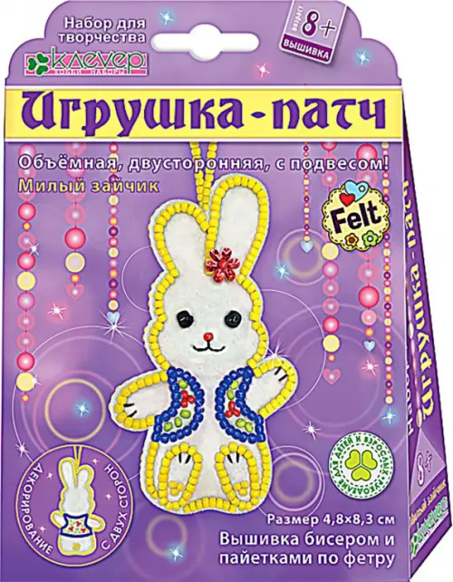 Милый зайчик - стилизованная двусторонняя набивная игрушка из белого фетра, декорированная цветным контрастным бисером и блестящей яркой пайеткой. С помощью набора "Милый зайчик" ребёнок старше 8 лет научится шить простые игрушки и вышивать несложные декоративные узоры: нашьёт на фетр нити с бисером и украсит их пайеткой для акцента, вырежет из фетра стилизованные силуэты, сошьёт их вместе и наполнит синтепухом — получится игрушка-подвес — «солнечный» милый зайчик — брелок для сумочки или брошь.