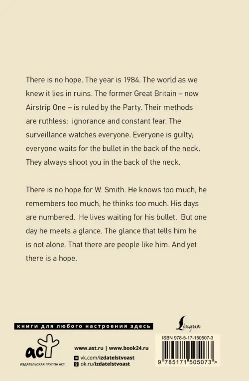 Книга издана в неадаптированной версии. Наслаждаясь языком и новоязом Дж. Оруэлла в оригинале, не забывайте, что БОЛЬШОЙ БРАТ ПРИСМАТРИВАЕТ ЗА ВАМИ.
