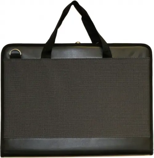 Крепление листов осуществляется с помощью 2-х эластичных отстегивающихся лент. По периметру папка закрывается на широкую молнию с двумя «бегунками». Комплектуется плечевым ремнем.