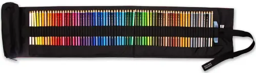 В наборе 72 цветных карандаша, ластик, точилка, рулонный футляр-пенал для хранения.