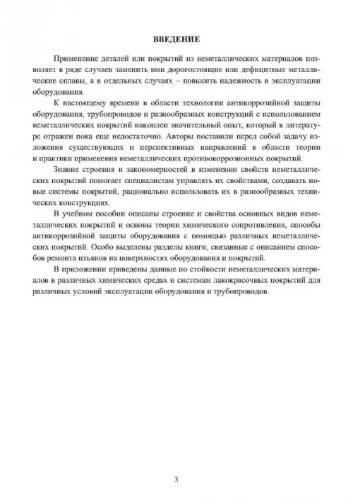 Приведены строение и свойства неметаллических конструкционных материалов и противокоррозионных покрытий на их основе, способы нанесения и ремонта покрытий, справочные данные по химической стойкости неметаллических материалов в различных средах.