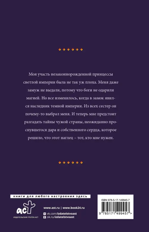 Моя участь незаконнорожденной принцессы светлой империи была не так уж плоха. Меня даже замуж не выдали, потому что боги не одарили магией. Но все изменилось, когда в замок явился наследник темной империи. Из всех сестер он почему-то выбрал меня. И теперь мне предстоит разгадать тайны чужой страны, неожиданно проснувшегося дара и собственного сердца, которое решило, что этот наглец – тот, кто мне нужен.