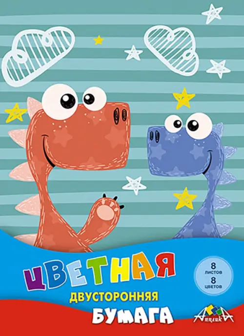 Цветная бумага двухсторонняя Друзья-динозаврики, 8 листов, 8 цветов