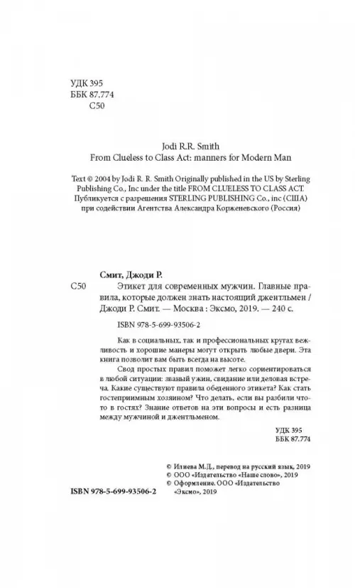 Если вы обнаружили ошибку в описании товара «Этикет для современных мужчин. Главные правила, которые должен знать настоящий джентльмен» (авторы: Смит Джоди Р.), то выделите её мышкой и нажмите Ctrl+Enter. Спасибо, что помогаете нам стать лучше!