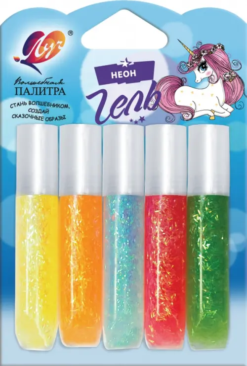 Гель Луч Неон предназначен для придания необычных переливающихся эффектов вашим работам и рисункам. В его составе тысячи мелких переливающихся блесток (глиттер). Гель используется для украшения рисунков, открыток, поделок из глины, гипса, воска, солёного теста, фольги, стекла и т.п.