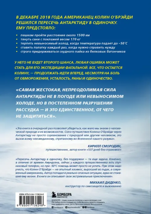«Пересечь Антарктиду в одиночку, без поддержки — та еще задача. Конечно, в отличие от времен Амундсена, сейчас у каждого путешественника есть спутниковый телефон, но при -50° C помощь может просто не успеть. При этом надо учесть, что Колин О'Брэйди — не опытный эскимос, выросший во льдах, а современный американец. Автор попадал в реально опасные ситуации, едва не стоившие ему жизни. В книге он описывает свои экстремальные приключения». — Михаил Диденко, инструктор по самозащите и выживанию
